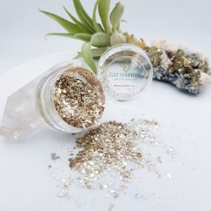 Yes, deze Sparkles mogen zeker niet in jouw collectie ontbreken deze Sprankelende winter! De mix bevat naast de metallic champagne kleurige glitters ook mooie heldere iridescent glitters, afhankelijk van het licht zie je hierin helder goud en licht blauwe reflectie met zeepbel glans. Heel speciaal dus! Het zijn heldere glitters in verschillende maten hexagon vorm die over het geheel helder champagne-goud van kleur zijn. Dat betekend maar liefst twee soorten Sparkles in deze mix: iridescent helder en metallic. Verder bevat de mix heldere iridescent glitterdust voor een nog subtielere glow! Deze mooie GLAMOUR glitters zijn een echte MUST-HAVE! Ze zijn super sparkly en perfect voor elke glamour gelegenheid, van een winter festival tot een NYE party. Haal jouw inner GLAMOUR QUEEN naar boven en creeër de perfecte partylook in een handomdraai. Een ding is zeker de Champagne Poppin’ Chunky Glittermix laat jou oogverblindend stralen!