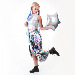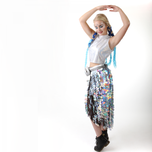 Onze eerste collectie festivalkleding! En helemaal handgemaakt en uniek. Draag de rokken over een kort broekje of lange jeans en combineer hem met leuke laarsje voor de ultieme festival look. Als jij danst weerkaatsen de grote pailletten van de Sparkle Rok het licht alle kanten op. Zo ben jij het stralende middelpunt op elke party! De Sparkle Rok is gemaakt van een doorschijnende mesh stof met grote holografische pailletten erop. De stof zit vast aan een rekbare band die op de hoogte van een high waist broek gedragen kan worden. De maat van de omtrek zit dus tussen je heup en taille maat in. Wij adviseren dit even op te meten voordat je er een besteld!
